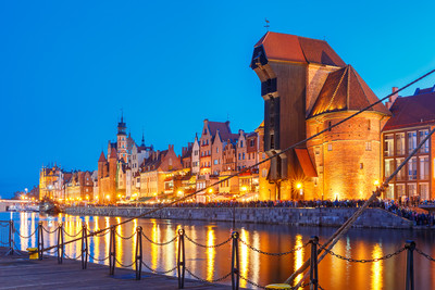 Гданьская набережная со старым портовым краном Журав вечером