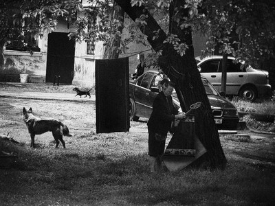 хорошая картинка: диагональ слева направо, линия собак, угол дерева, угол машин. Главное действующее лицо и арка деревьев. И нет суеты, все в гармонии