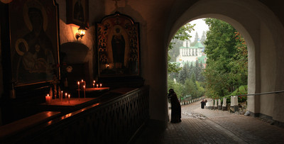 У входа на территорию Псково-Печорского монастыря