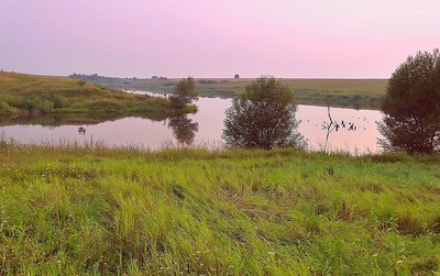 Вечерняя заря Тишина… Всё успокоилось после вечерней грозы, не слышно даже пения птиц. Только дымка испарений подчеркивает и увеличивает цветность розового заката. Полегшая и влажная от прошедшего грозового шквала трава охлаждает и бодрит. |