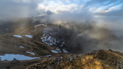 Брокенский призрак Бро́кенский призрак (нем. Brockengespenst), также называемый горным призраком — тень наблюдателя на поверхности облаков (тумана) в направлении, противоположном Солнцу. Эта тень может казаться очень большой и иногда окружена цветными кольцами (так называемая глория)[1]. Призрак может и шевелиться (иногда совершенно неожиданно) из-за движения облачного слоя и колебания плотности в облаке. |