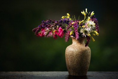 Букет полевых цветов в глиняной вазе