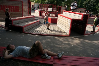он сидит как будто на полукруглой как будто скамье