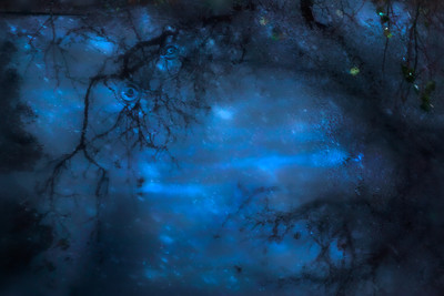 Отражение в луже с сыплющимся с неба снегом