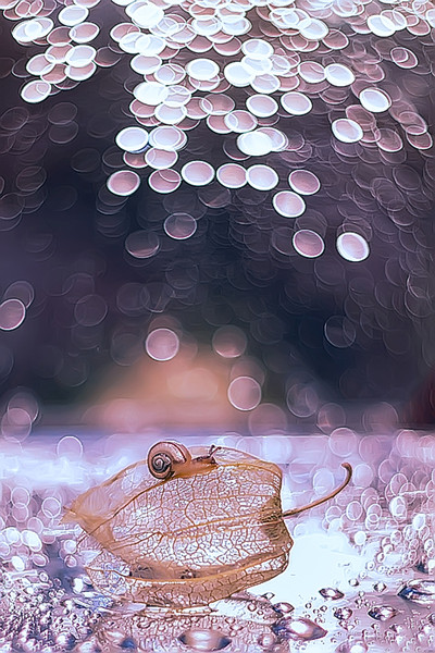Влад, улиточка очень маленькая, она реально сама размером с каплю, но т.к. в зоне резкости, то кажется мельче, чем бокешка. Полтинником на мануале снять ее не очень просто.