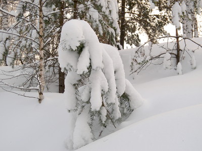 , эта маленькая сосенка похожа на уставшего путника с тяжелой ношей. ( а может шубка тяжеленькая)