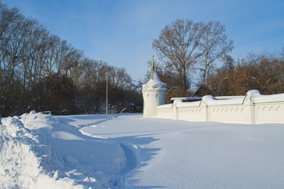, вдоль белой стены белый снег отражающий синее небо...