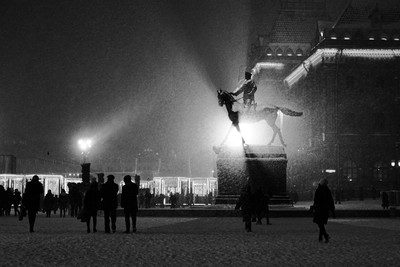 Памятник маршалу Жукову во время снегопада