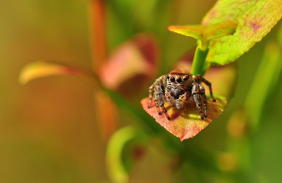 паук скакунчик на черничных листочках