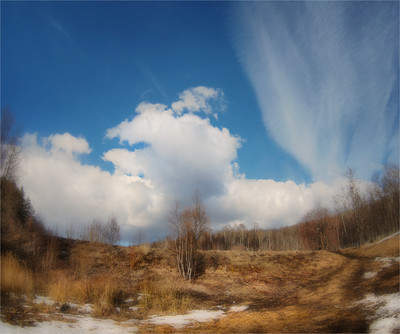 Влад, если это не риторика - ну, допустим, не риторика) - отвечу.Мне здесь нравится особенная прозрачность, такая промытость цвета. Пушение - если есть такое слово) - сухой травы, переходящее в растворение её. Ещё нравится группа деревьев по центру. Вообще - мне фишайность не мешает никогда, здесь она есть - намёком некиим. Ну и пусть. Вот ещё - облака повторяют то, что понизу. |
