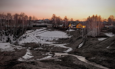 Пейзаж с желтым домиком на закате