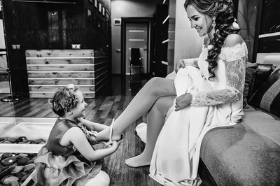 Муна, это племянница невесты. Кадр не постановка. Успел - схватил. Ребёнок баловался рядом, подбежал, схватил туфлю невесты и начал одевать ей...