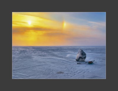 На льду Жигулевского моря. Рыбак скрывается от ветра в полиэтиленовом мешке.