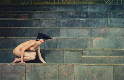 нравится плоскость! вместе со странным головным убором и позой модели напоминает рисунки Египта. верх и последние две ступеньки обрезала бы.. цвет шикарен. чего все панику подняли?.. хорошая работа ведь.