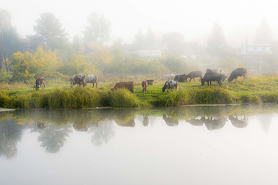 Стадо коров на берегу реки