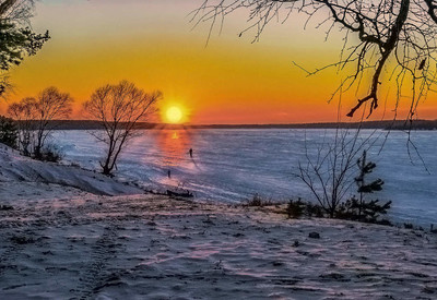 Лыжники на Волге в лучах закатного солнца.
