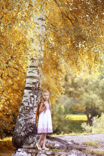 красивая девочка и дерево необычное... но... как-то не по детски (не по девичьи) модель держит кофточку. обычно так (во времена моей молодости) ребята пиджаки носили. за петельку.