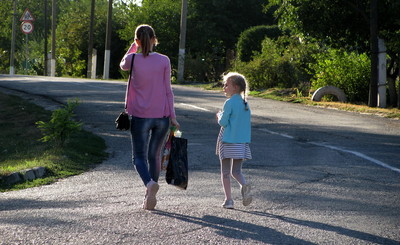Солнечно.По улице села идут домой мама с дочкой...