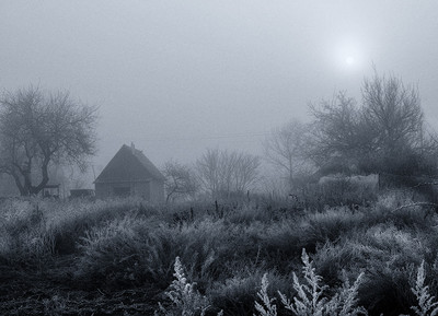 Такие заросли..,а домик как из детской сказки..Изморозь и туман всё поглатили...