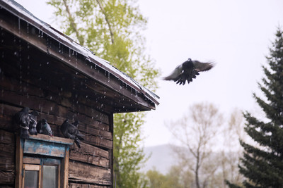 На улице начался дождь с градом и голуби ищут место спрятаться