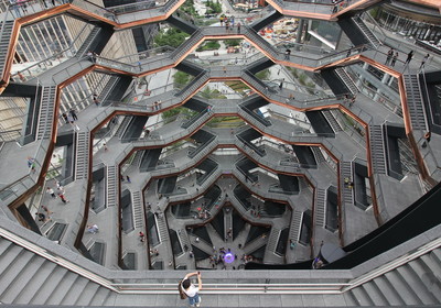 Vessel (TKA) | Hudson Yards это сооружение и ориентир, построенный в рамках проекта реконструкции Хадсон-Ярдс в Манхэттене , Нью-Йорк , Нью-Йорк . Строительство началось в апреле 2017 года; он открылся 15 марта 2019 года. Разработанная британским дизайнером Томасом Хизервиком , сложная конструкция в виде сот занимает 16 этажей и состоит из 154 лестничных маршей , 2500 ступеней и 80 посадочных площадок , на которые можно подняться. Vessel является главной особенностью публичной площади Гудзон-Ярдс площадью 5 акров (2,0 га). Ожидается, что его окончательная стоимость составит 200 миллионов долларов. Название структуры является рабочим названием, отмеченным в аббревиатуре TKA, что означает «временно известный как». Владельцы структуры попросили общественность дать ей официальное название и создать сайт, посвященный ее названию. Одним из наиболее обсуждаемых имен в социальных сетях было « Шаурма », после конусообразного мяса, популярного на уличных тележках |