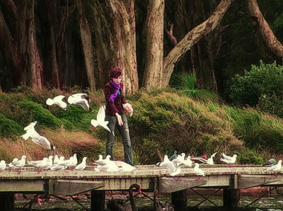 Очень впечатляющая работа! Сильно действует контраст темного мрачноватого леса и белых птиц, сочетание ярких цветов , поза девушки - создает ощущение фотополотна, а не простой копии действительности.