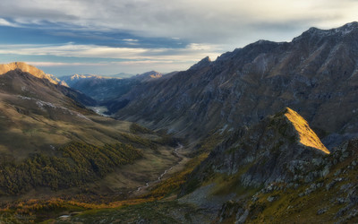 КЧР, окрестности Архыза, верховья р. Ацгара с Загеданского хребта спустя полчаса после восхода.