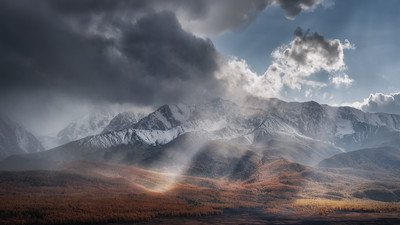 В потоках света Переменчивая погода всегда дарит самые потрясающие и неожиданные зрелища. На снимке запечатлены подсвеченные косыми лучами солнца потоки дождя. Вид с урочища Ештыкель на передовые гребни узла Биш-Иирду (Северо-Чуйский хребет) и уходящую прочь грозу. Улаганский район, Республика Алтай, сентябрь 2019 |