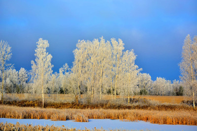 Оригинально выглядит ярко освещённая рыжая трава в сочетании со льдом и инеем.