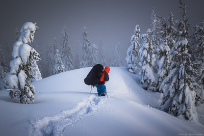 Не знаю - почему этого туриста кто-то принимает за ребёнка - видимо из=за размера рюкзака, но ель слева больше похожа на инструктора, чем этот путешественник на дитя. Замечательное фото с подходящим названием!