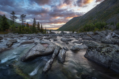 Мультинский ящер Первосентябрьские дни на Мультинских озерах не радовали хорошей погодой. Временами моросил дождь, дул сильный ветер, буквально сбивавший с ног, превращавший ветви деревьев и траву на берегах озер на снимках в невыразительную размытую кашу, а водную гладь - в неспокойную серую массу. В то утро выдался выразительный рассвет и я приняла решение снимать с Шумов, несмотря на сложные ветровые условия. Прыгая по валунам, в какой-то момент я заметила заполненное водой углубление в одном из камней и принялась искать лучший ракурс для съемки. Результат поиска поразил - из бурных вод на меня смотрела голова самого настоящего каменного динозавра. Кто знает, может быть это сам дух Мультинских озер? |