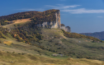 У подножья Ахмет-Горы... Урупский район Карачаево-Черкессии, октябрь. Ахмет-Гора (1313,7 м) - наивысшая точка длинной семикилометровой куэсты под общим названием Ахмет-Скала, расположенного в западной части Скалистого хребта на административной границе Карачаево-Черкесии с Краснодарским краем. Высота скальных обрывов куэсты местами превышает 200 м. Окрестности горы весьма живописны и фотогеничны, а сама она популярна у скалолазов и BASE-джамперов. |