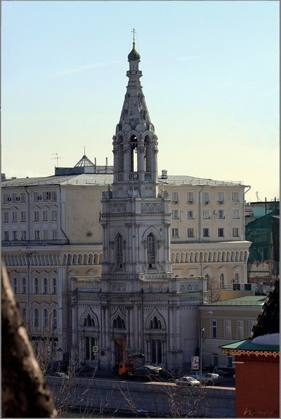 Без названия Надвратный храм иконы Богоматери Взыскание погибших...Отдельно стоящая трехъярусная шатровая колокольня была построена в 1860-х годах по проекту архитектора Н.И. Козловского. Нижний этаж монументального первого яруса в центре имеет сквозной проезд на церковный двор, на втором – храм . Второй ярус – четверик. На третьем ярусе – восьмерике – размещаются колокола. он увенчан шатром с главкой и крестом. Колокольня, построенная в русско-византийском стиле, соперничала по высоте с завершенным в 1859 году храмом Христа спасителя. |