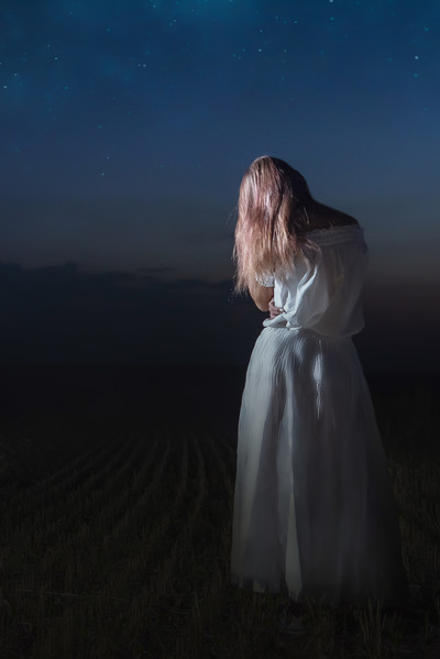 Девушка в белом платье, ночью в поле.