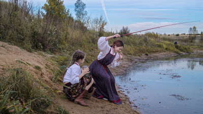 Девочки на стиле...а удочка современная...хворостина длинная более подошла бы)))