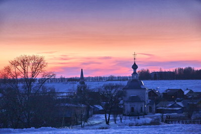 Ансамбль церквей Богоявления Господня и Рождества Иоанна Предтечи. ..Перейдя мостик, пройдем к группе храмов старой Кожевенной слободы Суздаля в излучине Каменки. Эта типичная для суздальской архитектуры «пара» зданий — Богоявленская летняя (1781) и Рождественская «теплая» (1739) церкви — красиво расположена на луговине поймы Каменки. Более ранняя Рождественская церковь с ее тоненькой главкой и простыми фасадами очень интимна и задушевна. Ее западный торец венчает колокольня со стройным, слегка вогнутым шатром, напоминающая несуществующую колокольню Входо-Иерусалимской церкви. Большая Богоявленская церковь близка по своей архитектуре Знаменской церкви, но в ее обработке больше новшеств: пояс кокошников заменен простым карнизом, углы четверика и притвора обработаны в два ряда рустами, восьмискатная кровля с пучинами сменила декоративное решение верха, над ней поднимается восьмигранная двухъярусная глава. По книге Н.Н. Воронина ... |