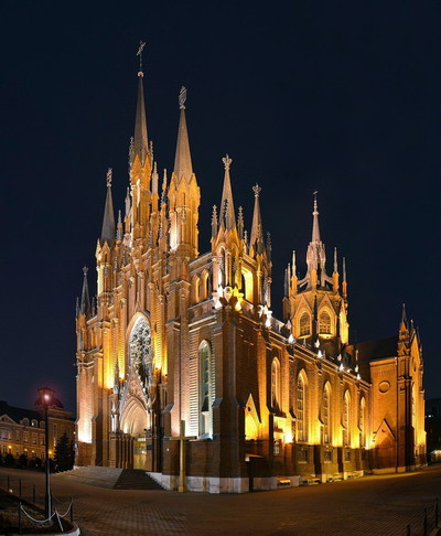 "Пламенеющая готика" Католический собор Непорочного зачатия Пресвятой Девы Марии на Малой Грузинской. Cчитается, что прообразом фасада послужил готический собор в Вестминстере, а прообразом купола явился купол кафедрального собора в Милане. Основной объём храма был построен в 1901—1911 годах в стиле неоготики |