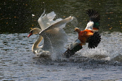 Динамика сумасшедшая! Что интересно, огарь вроде птица мирная, спокойная. А тут вдруг такая атака! Поздравляю, Николай, с ОЧЕНЬ удачным кадром! У нас в яхт-клубе огари, гуси, утки и лебеди мирно сосуществуют. Видимо, пакт о ненападении заключили...