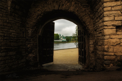 Вид на Мирожский монастырь из ворот Покровской башни. Башня крепостной стены окольного города Пскова XV век.
